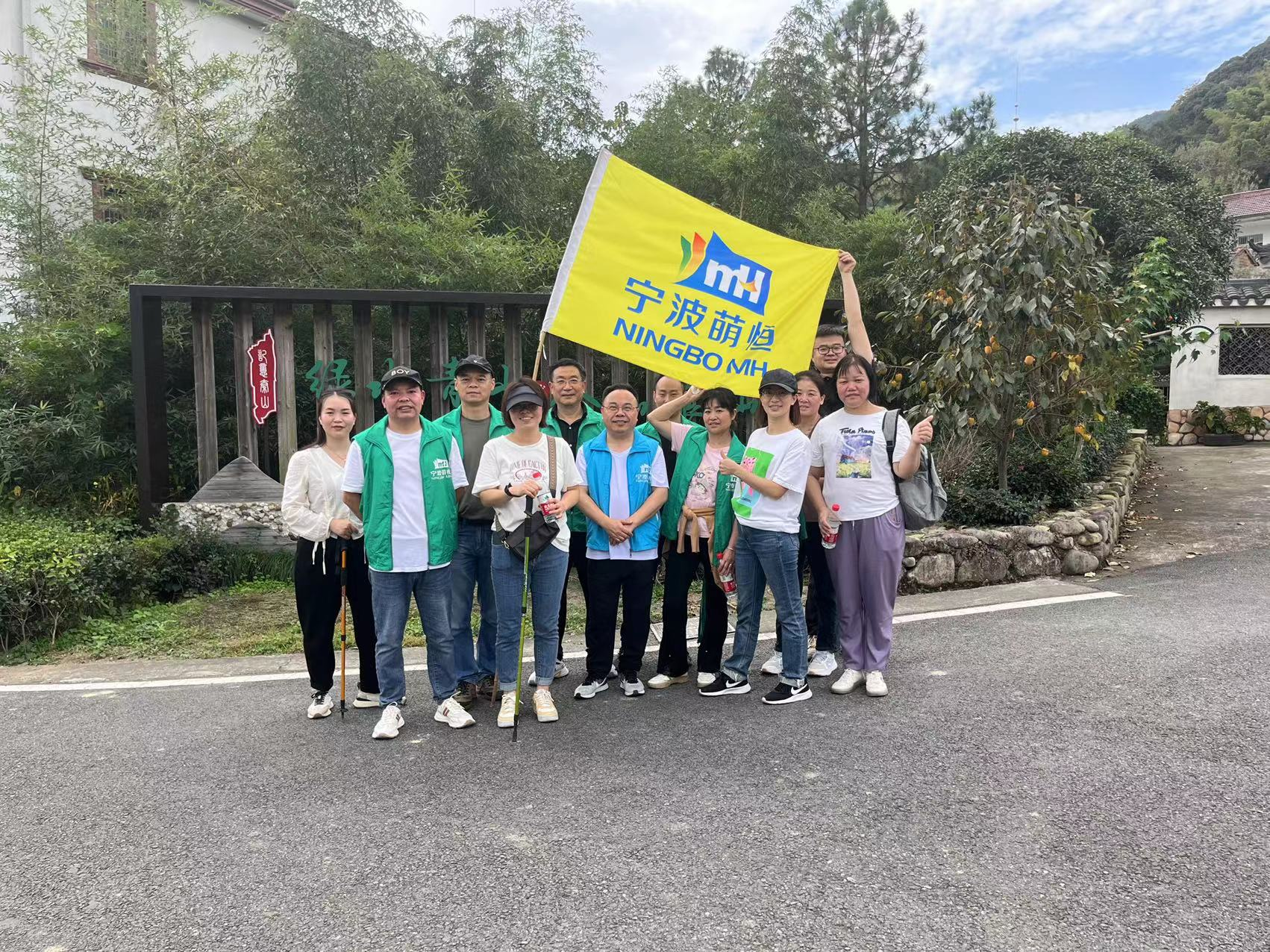早上8點(diǎn),10支隊(duì)伍的130多名萌友準(zhǔn)時(shí)在洪塘基地辦公樓前集合,由領(lǐng)隊(duì)帶領(lǐng)大家做熱身運(yùn)動(dòng)。熱身結(jié)束后,簡(jiǎn)短地宣講了徒步中的注意事項(xiàng),拍完集體大合照,全員就乘坐大巴車奔向本次徒步團(tuán)建的第一站——毛力水庫(kù)。