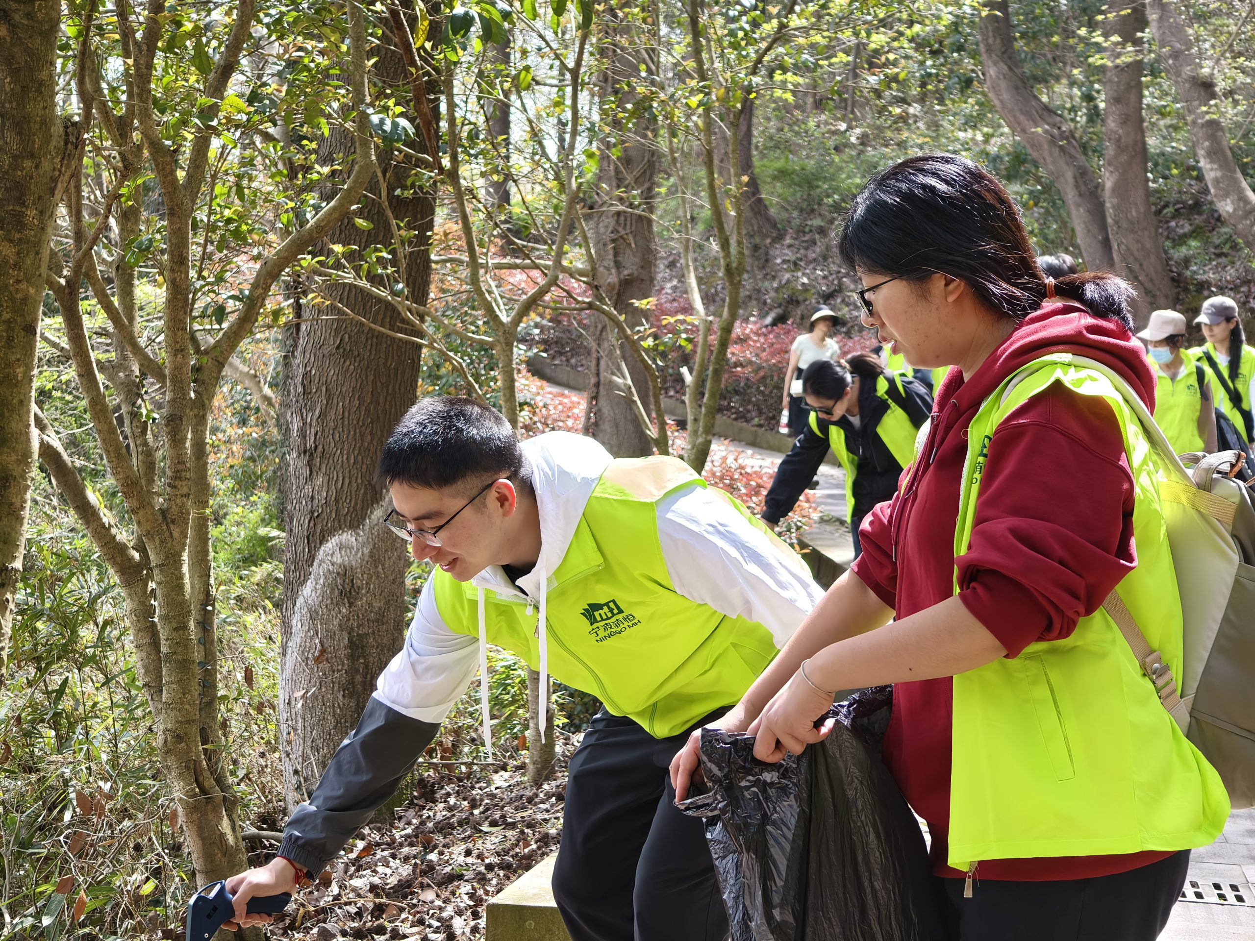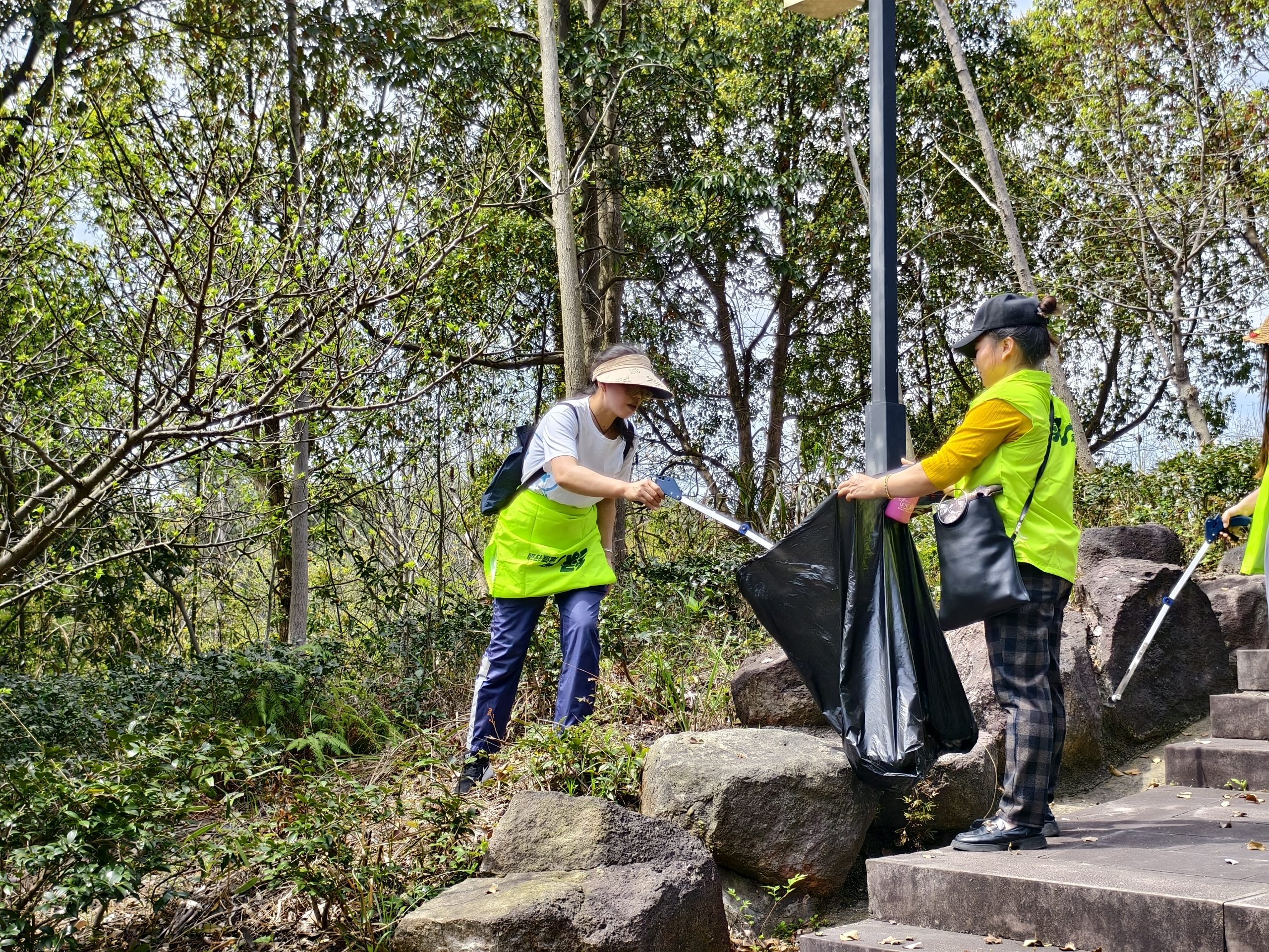 上午九點,所有小伙伴準(zhǔn)時乘坐大巴前往海曙區(qū)鄞江鎮(zhèn)它山堰,開啟綠色徒步行。走進(jìn)山林,陽光明媚,天朗氣清。身穿綠色背心的志愿者兩兩一組,分工明確,一個手拿垃圾鉗,一個手拿垃圾袋,仔細(xì)搜尋沿途的每一個角落,不落下任何一個垃圾,即使是隱藏在樹林草垛中的垃圾也被志愿者們“收入囊中”。一俯一仰間,他們共收獲了十余袋各色垃圾,經(jīng)過的每一處,留下的只有青山碧水、綠樹紅花。