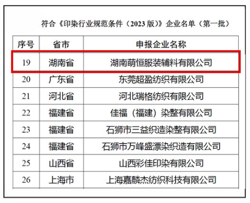為推動印染行業結構調整和轉型升級,引導行業高端化智能化綠色化發展,根據《印染行業規范公告管理辦法》有關規定,工信部今年組織開展了印染企業規范公告申報和復核工作。經企業自主申報、省級工業和信息化主管部門核實推薦、專家組評審、征求生態環境部意見等程序,9月12日,公示通過了第一批符合《印染行業規范條件(2023版)》企業名單。其中,湖南有三家企業入圍,萌恒榜上有名!