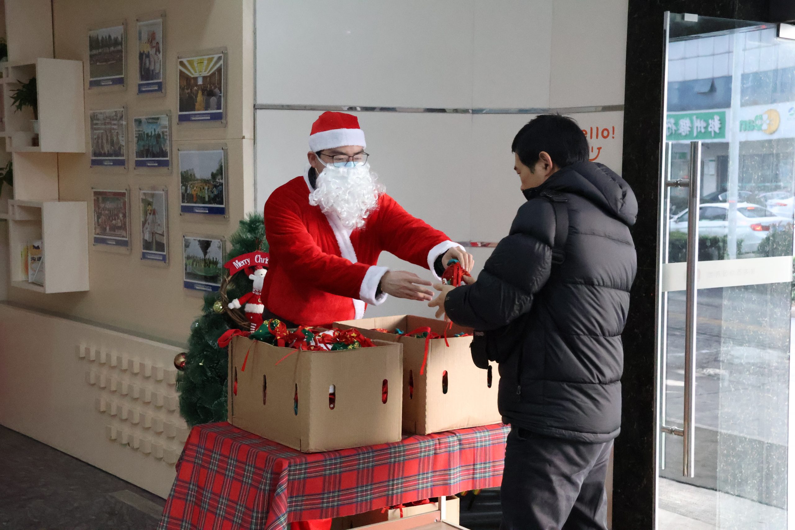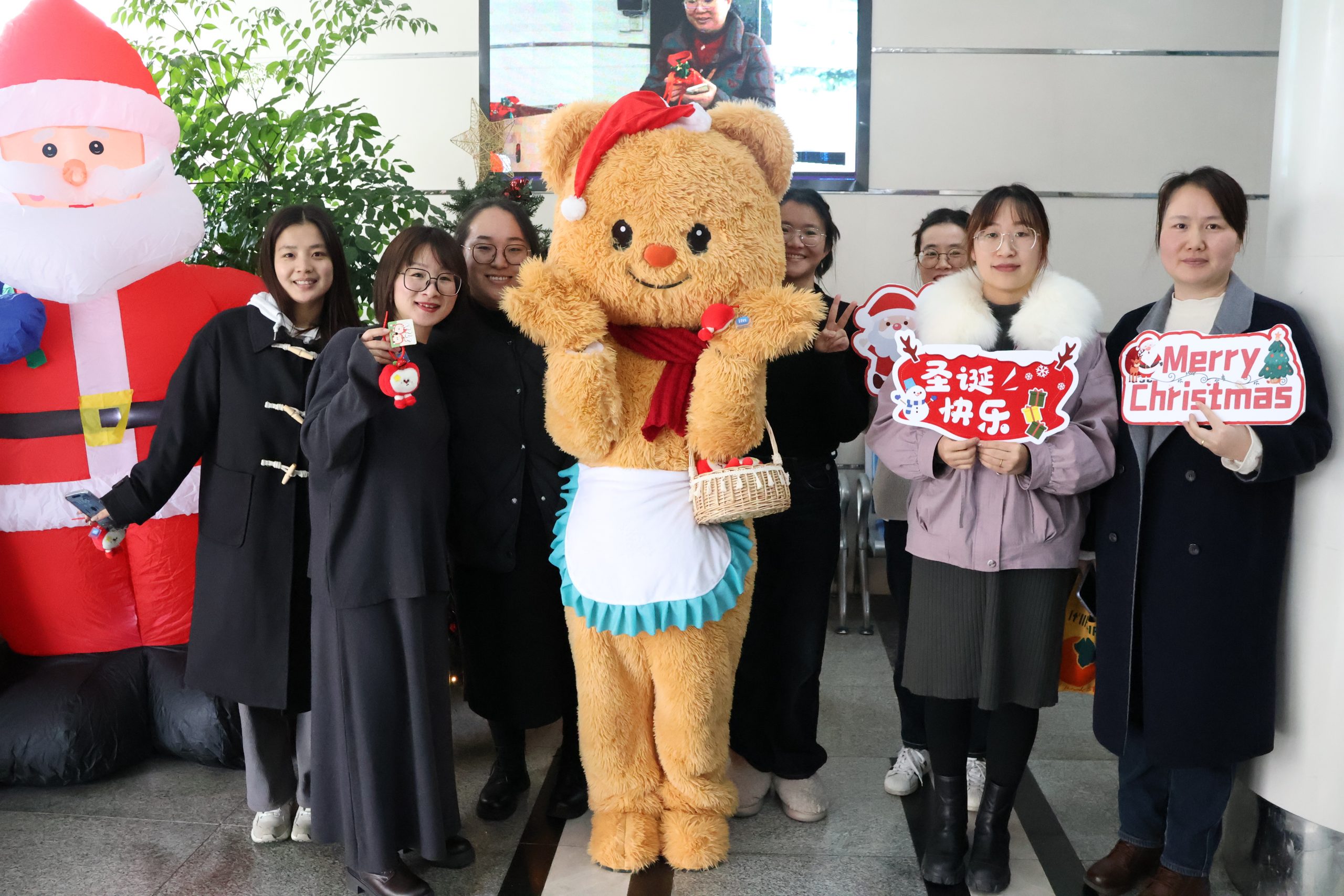 12月25日,國貿(mào)事業(yè)部的工作人員早早守候,化身圣誕老人,將一份份“蘋” 安果禮袋送到大家手中。紅蘋果在晨光下閃耀,糖果散發(fā)著甜蜜氣息,掃碼抽獎的小賀卡暗藏驚喜,為新的一天注入滿滿活力,開啟專屬于萌恒人的圣誕好運。中午時分,一樓大廳瞬間成為歡樂的海洋,萌態(tài)十足的黃油小熊,一出場就吸引了小伙伴們的目光。大家紛紛前來與小熊擁抱、互動、合影。它搞怪的動作、溫暖的 “熊抱”,?引來笑聲連連,傳遞別樣的活力與溫馨。