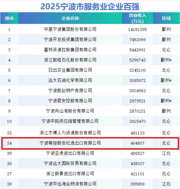 9月10日,寧波市企業聯合會、寧波市企業家協會、寧波市工業經濟聯合會聯合發布了2025寧波企業百強榜單。萌恒憑借過去一年的穩健發展與綜合實力,榮登2025寧波市服務業企業百強第34位、2025寧波市綜合企業百強第95位,相較去年實現排名雙攀升!